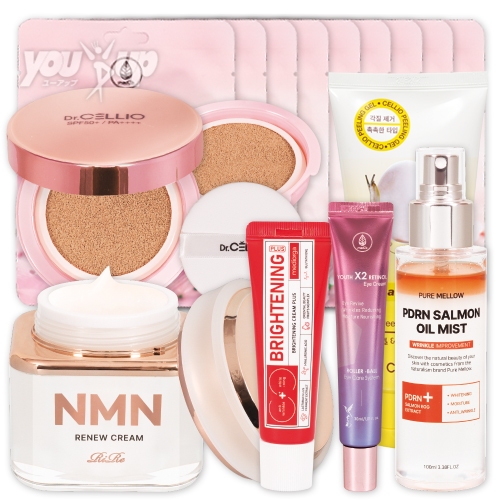 | 内容量 | [プラセンタMAXモイストパック]1枚×10 [アイリバイブ目もと改善レチクリーム]30ml [ブライトニングクリーム(プラス)]30ml [NMN&PDRNオールインワンクリーム]50g [PDRNオイルミスト深層化粧水]100ml [オーラクッションファンデセット]本体14g+詰め替え用14g [かたつむり卵肌ポロポロジェル]180ml |