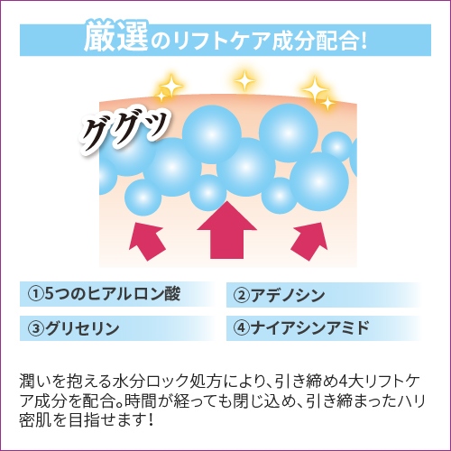 大きさの異なる5つのヒアルロン酸が「ほぐす」「注入」「抱え込む」の3段階で、肌の状態によって見定め、内側から押し上げるハリを解き放ちます。