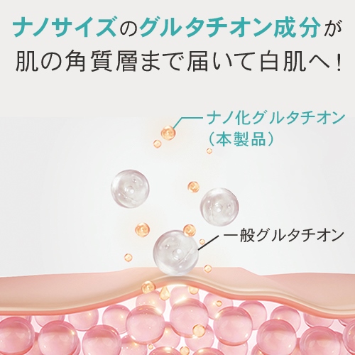 主成分はナノリポソーム化したグルタチオン、シミケア成分のナイアシンアミド、肌鎮静成分のCICAも配合されており、さらにヨモギや酵母を含む特許成分により、肌のキメを整えます。