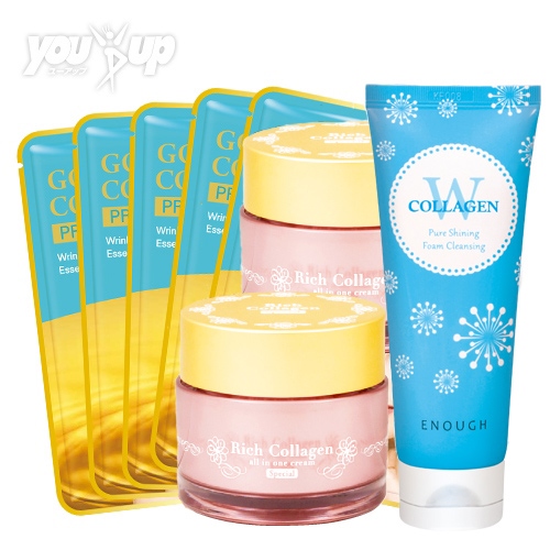 | 内容量 | [コラーゲンプレミアムモイストパック]1枚×5 [Wコラーゲン洗顔フォーム]100g [リッチ生コラーゲンオールインワンクリーム(スペシャル)]50ml×2 |