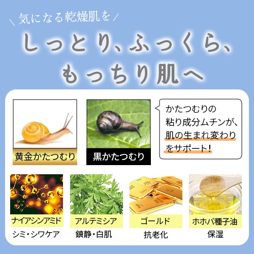 肌リセット力のあるかたつむりの粘液に加え、ナイアシンアミド、アルテミシア、ゴールド、ホホバ種子油等を配合しており、乾燥知らずのしっとり、ふっくら、もっちり肌へと導きます。