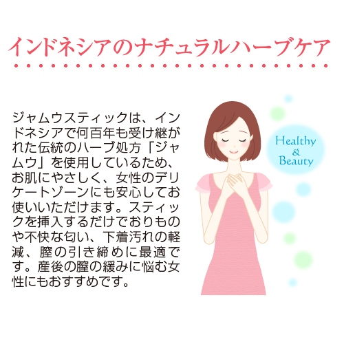 ジャムウスティックは、インドネシアで何百年も受け継がれた伝統のハーブ処方「ジャムウ」を使用しているため、お肌にやさしく、女性のデリケートゾーンにも安心してお使いいただけます。