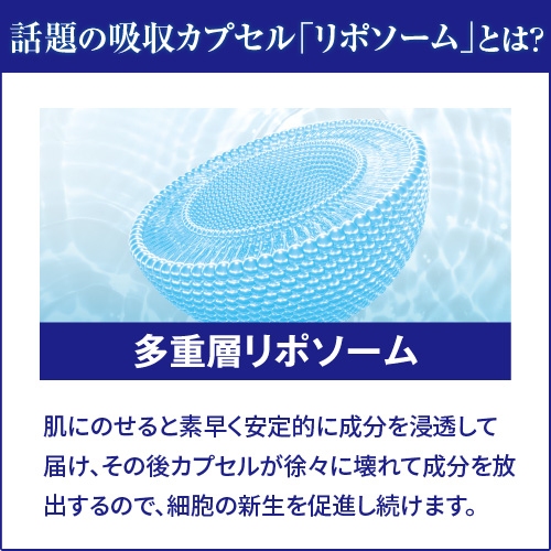 吸収が難しい水と油の相反する成分を肌に吸収可能な球体状に閉じ込め、根深い「シワ根っこ」まで効果的にアプローチします。更に、天然保湿因子NMF「ポリグルタミン酸(アミノ酸)」が新たに配合され、潤いをしっかりと保持します。