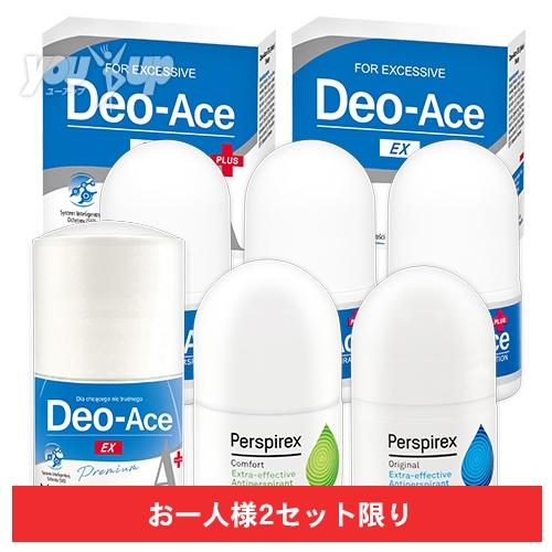 | 内容量 | [デオエースEX(プラス)]40ml [デオエースEX(プラス) 20ml]20ml×3 [デオエースソープEX(プラス)]100g×2 [デトランスα(ワキ用)普通肌]20ml [デトランスα敏感肌用(アルコールフリー)]20ml |